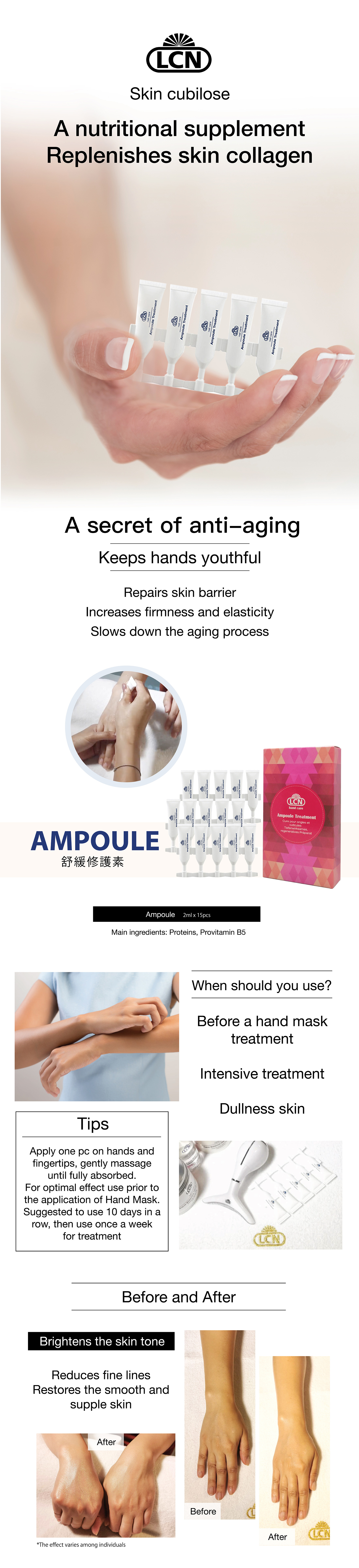 Repairs skin barrier, increases firmness and elasticity of hands, slows down the aging process, reduces wrinkles and fine lines, and replenishes skin collagen