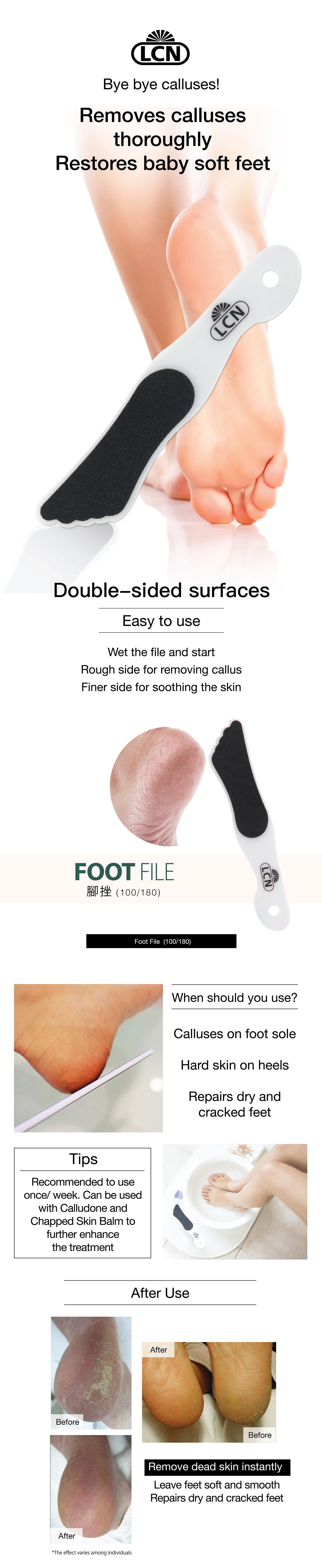 Rough side for removing callus, finerside for soothing the skin;