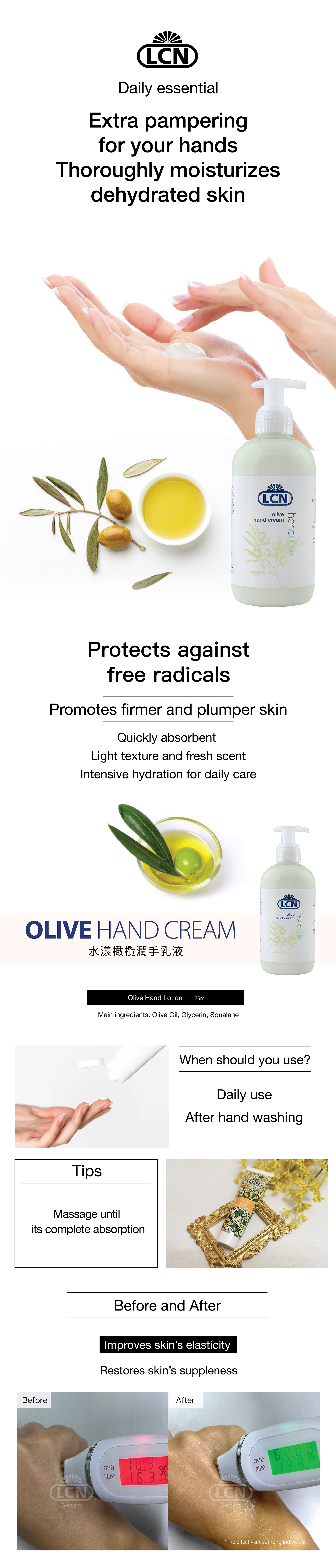 The Olive Hand Cream convinces with its fresh fragrance and offers a fast absorbing and light texture. In addition it provides a lot of moisture due to the glycerine and shea butter it contains. It is especially suitable for sensitive hands.