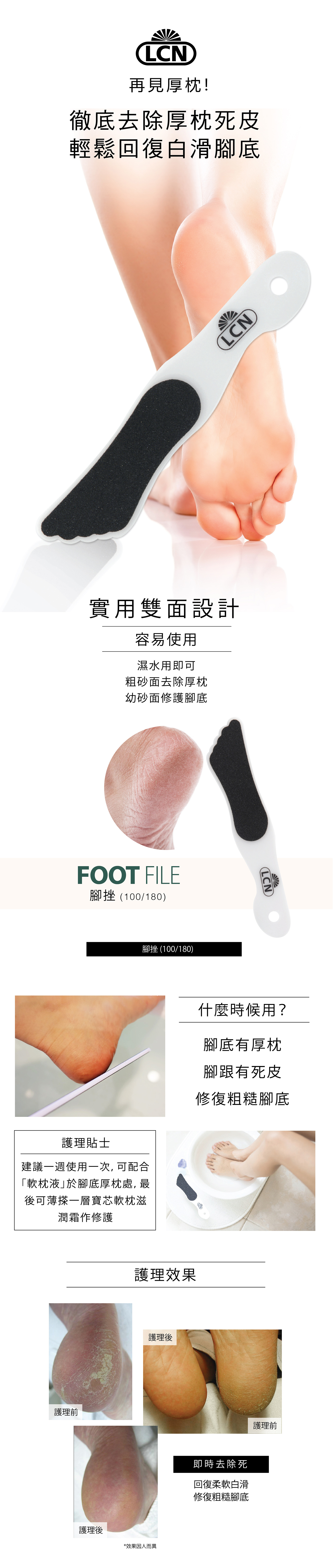 先以較粗糙面(100度)挫走腳底厚枕及粗糙死皮,再以幼面(180度)撫平肌膚,