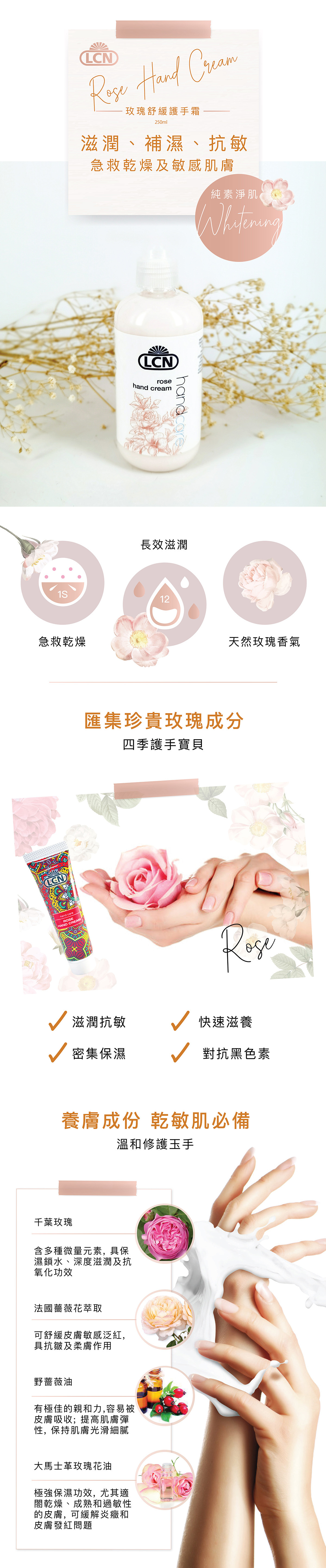 令手部回復柔軟,顯白有彈性。 天然玫瑰香氣, 適合乾燥、敏感及成熟肌膚