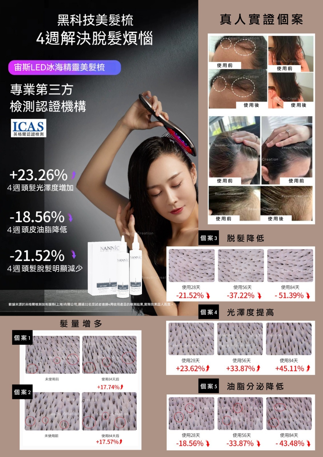 洗髮後,可配合Nannic 活髮營養液,開啟彩光模式從頭頂開始,慢慢向兩側梳刷,再從後頸背開始向頭頂方向刷。適合每天使用。